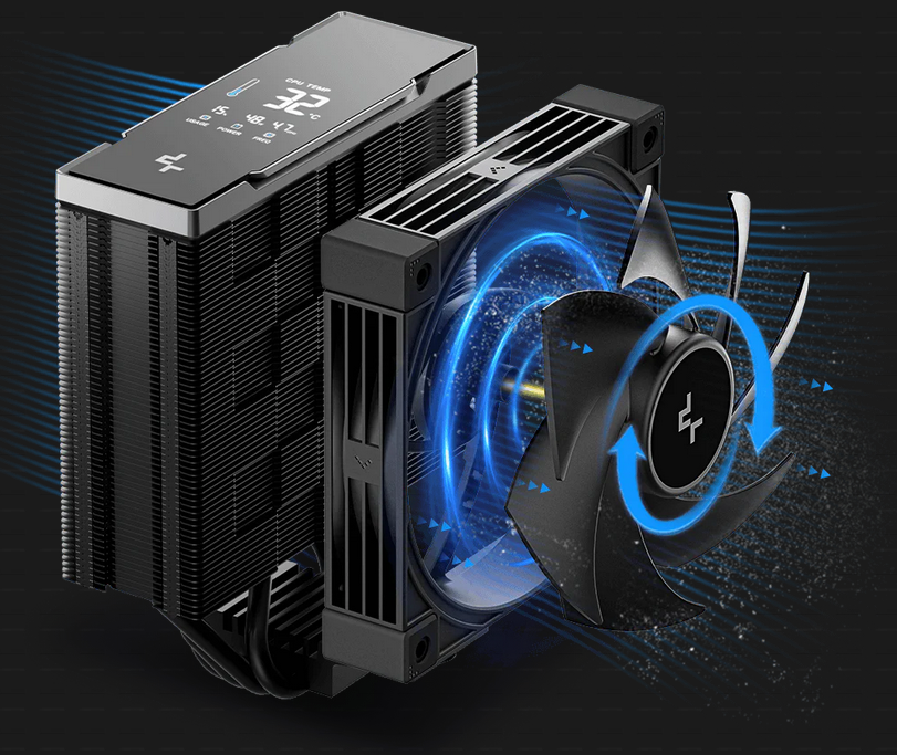 Cool, quiet, and powerful Equipped with high-quality hydraulic bearing and a three-phase, six-slot, four-pole motor, the AK400 G2 DIGITAL NYX's fan operates smoothly and quietly. 1. 0-RPM Startup/Stop effectively reduces noise and prolongs fan lifespan. 2. Activate Clearing Tech (ACT) within 8 seconds of power-on to initiate automatic dust clearing for both the fan blades and heatsink.
