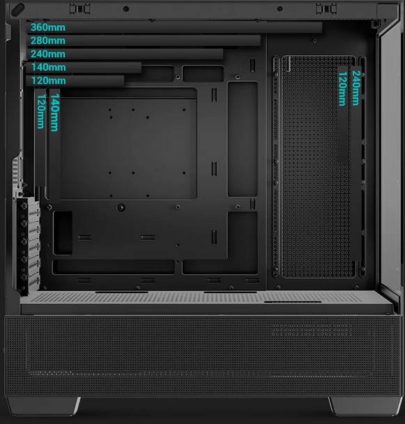 | Fan Support | Front: NA Top: 3×120mm/2x140mm Side: 2x120mm Rear: 1×120mm/1x140mm PSU Shrouded: 3×120mm |