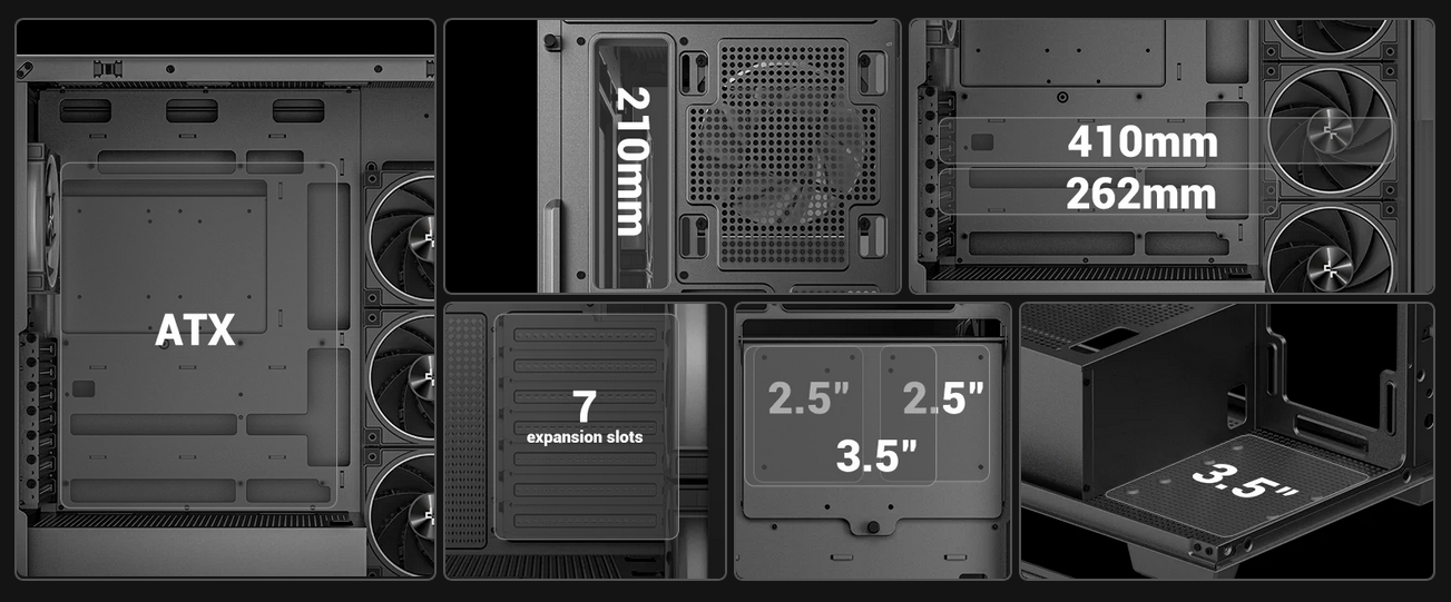 GPU Length Limit | 410mm (limited to 262mm if a 360mm radiator and fan set are mounted on the side) |