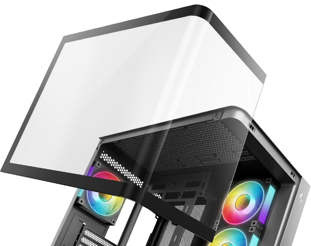 The CG530U 4F features a one-piece curved tempered glass panel that transitions smoothly around the corner. With no seams interrupting the line of sight, it offers an open, continuous view into the build within.