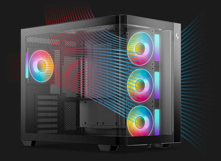 Efficient ventilation A dual-chamber layout isolates the power supply and storage drives from the main airflow. Large mesh panels maximize ventilation, with side-mounted reverse intake fans drawing in fresh air and the rear fan exhausting heat, creating a direct horizontal airflow path across the case. | ![]() |