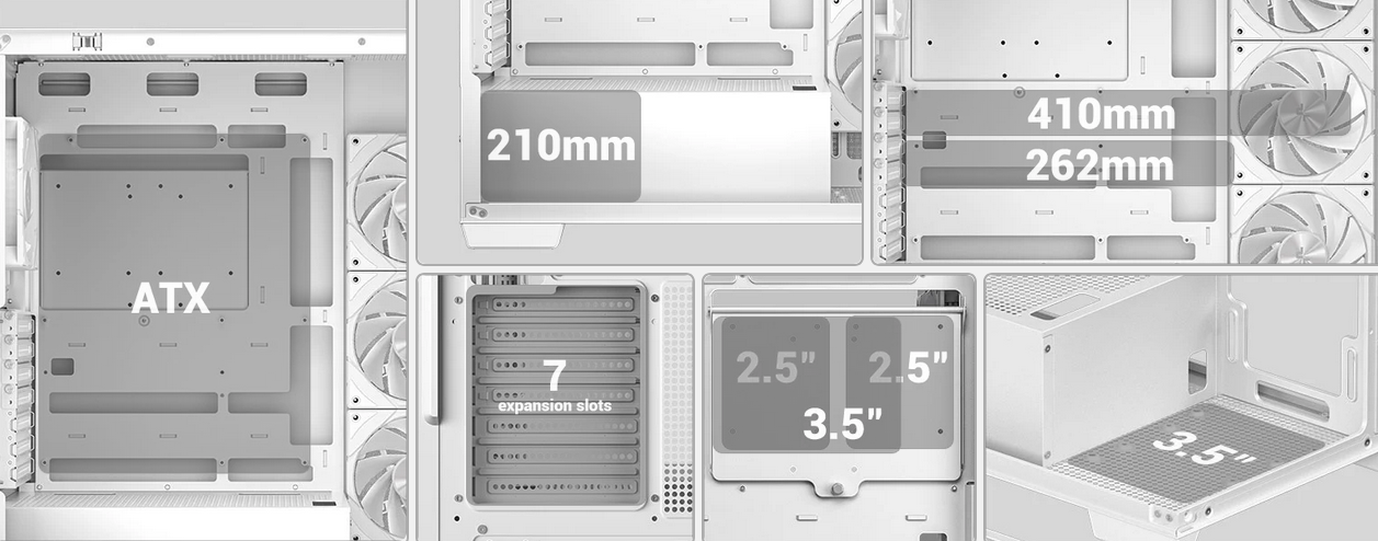 | GPU Length Limit | 410mm (limited to 262mm if a 360mm radiator and fan set are mounted on the side) |