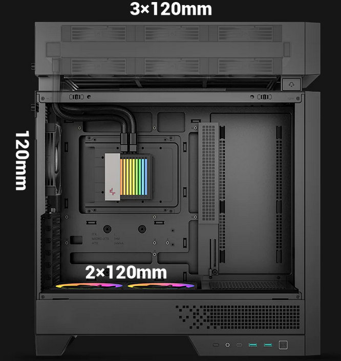 | Fan Support | Top: 3×120mm/2×140mm Front: 2×140mm Rear: 1×140/1×120mm Bottom: 2×120mm |