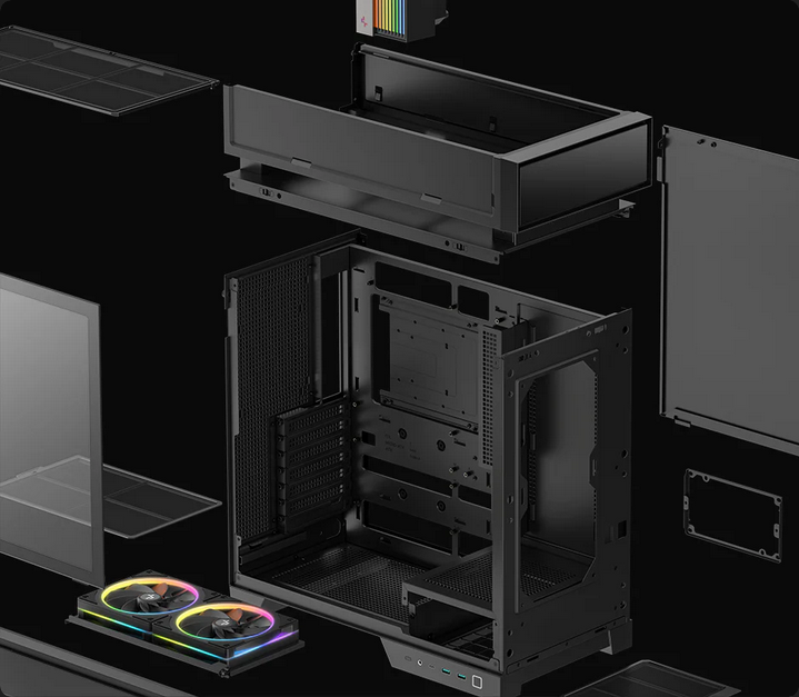 Maximize your cooling potential with support for 360mm AIOs and up to eight 120mm fans in total. Three 120mm fans or two 140mm fans can be mounted above the radiator in push-pull configuration (fan–radiator–fan).