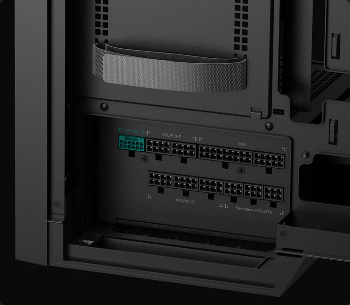 Front-Mounted PSU The PSU mounted horizontally at the front, with cable connections face the back of the motherboard. | ![]() |