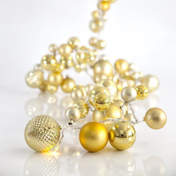 Този елегантен гирлянд в златен цвят с интегрирани коледни топки и LED светлини е идеален за добавяне на блясък и уют във вашето пространство.