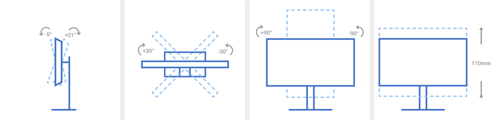 Tilt From -5°/+21° | Swivel Bi-directionally up to 30° | Pivot Bi-directionally up to 90° | Height Adjustability up to 110mm |