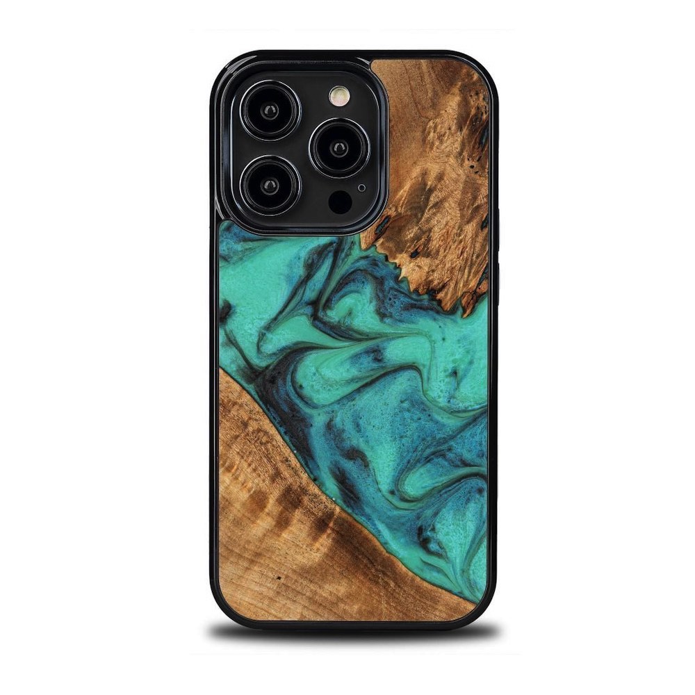 Дизайнерски хибриден (дърво+TPU) кейс за iPhone 14 Pro - Bewood Unique Turquoise Wood and Resin Case (син-кафяв)
