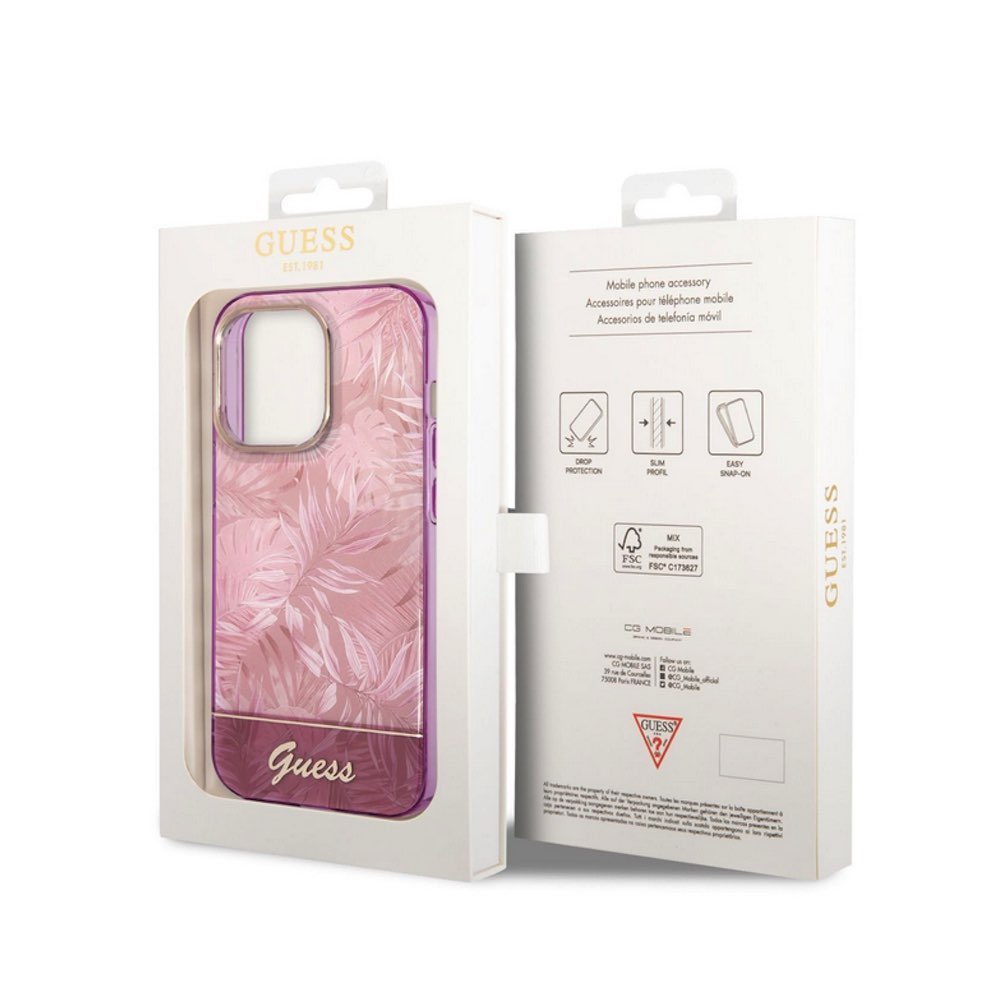 Дизайнерски кейс с висока защита за iPhone 14 Pro - Guess Jungle Hybrid Case (розов)