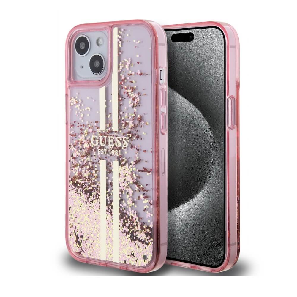 Дизайнерски кейс с висока защита за iPhone 15 - Guess Liquid Glitter Gold Stripe Case (розов)