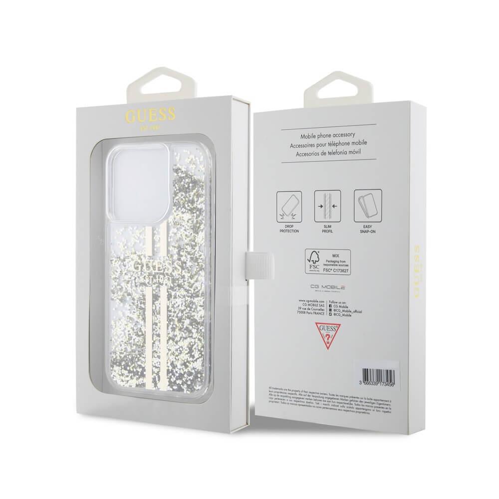Дизайнерски кейс с висока защита за iPhone 15 Pro - Guess Liquid Glitter Gold Stripe Case (прозрачен)