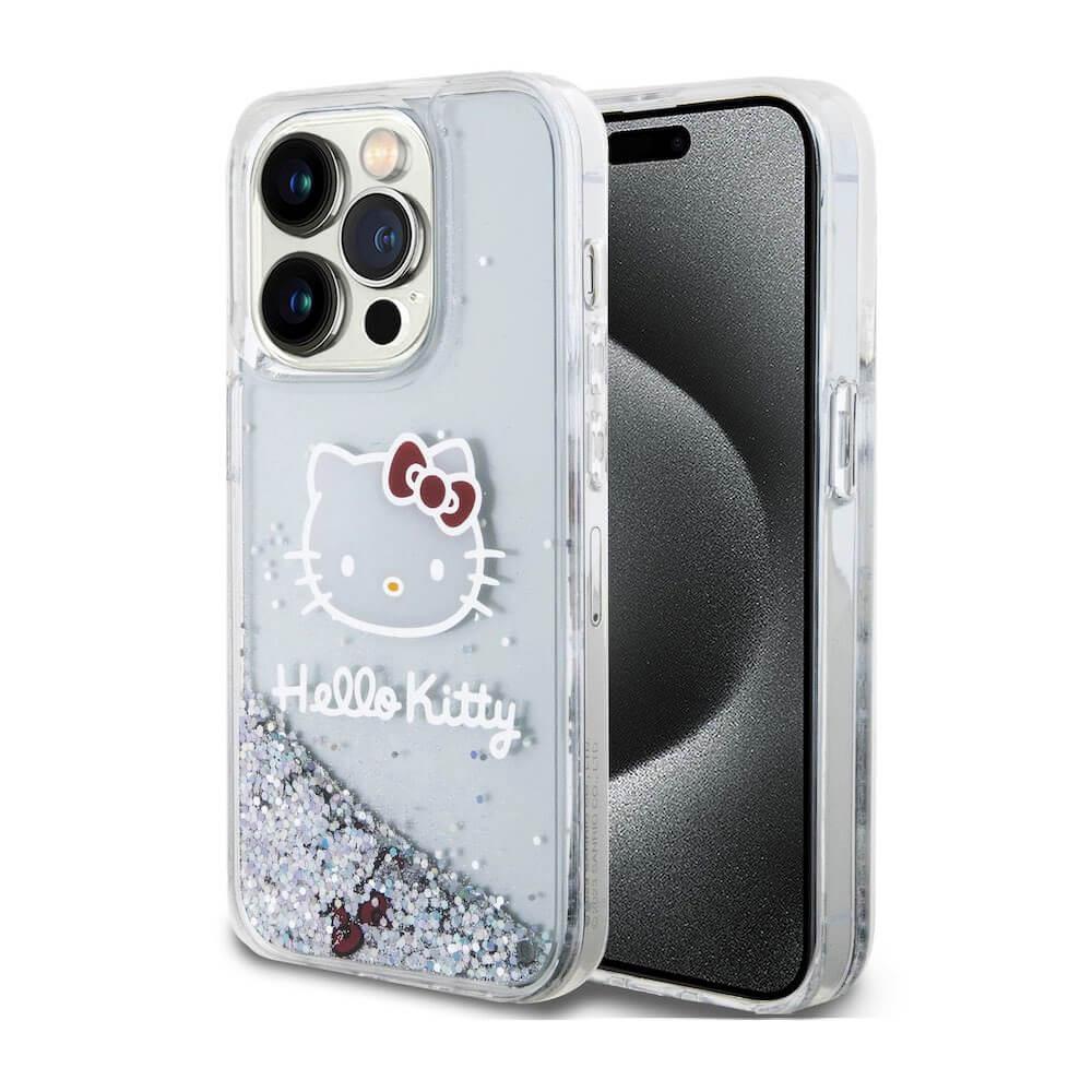 Дизайнерски кейс с висока защита за iPhone 15 Pro - Hello Kitty Liquid Glitter Electroplating Head Logo Case (прозрачен-сребрист)