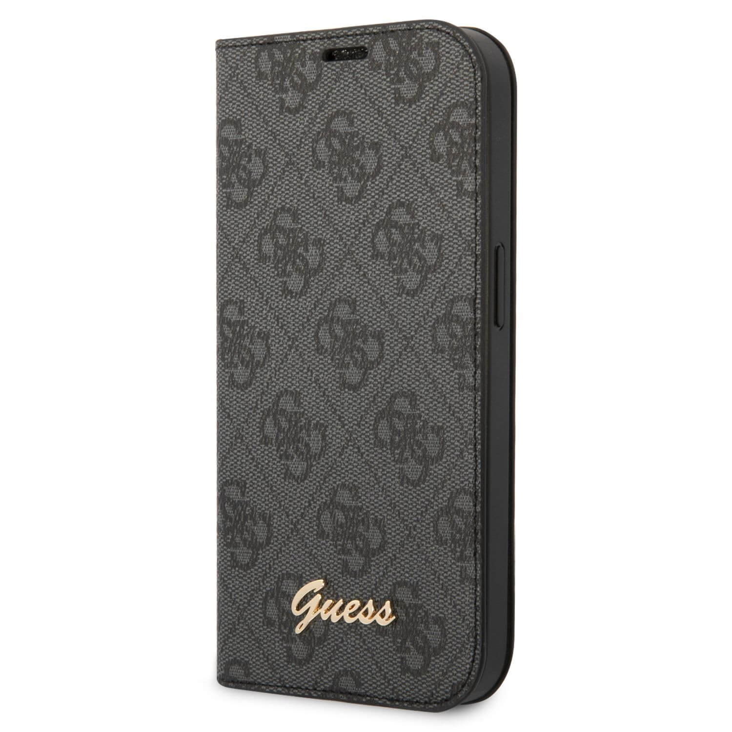 Дизайнерски кожен калъф, тип портфейл за iPhone 14 Pro - Guess 4G Metal Camera Outline Book Case (черен)