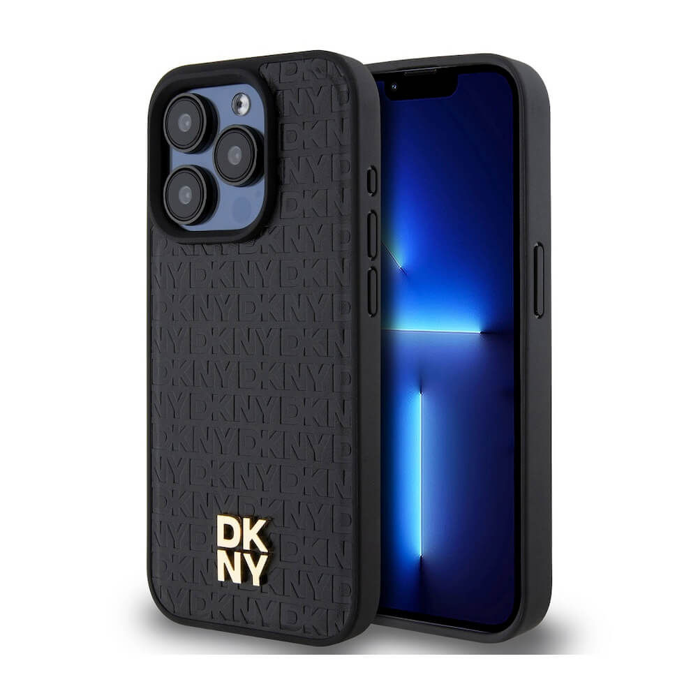 Дизайнерски кожен кейс с MagSafe за iPhone 12 Pro, iPhone 12 - DKNY Repeat Pattern Stack Logo MagSafe Leather Hard Case (черен)
