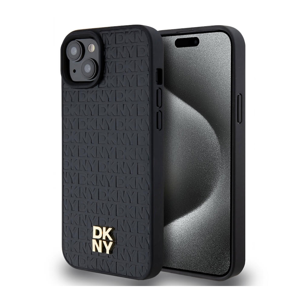 Дизайнерски кожен кейс с MagSafe за iPhone 13 - DKNY Repeat Pattern Stack Logo MagSafe Leather Hard Case (черен)