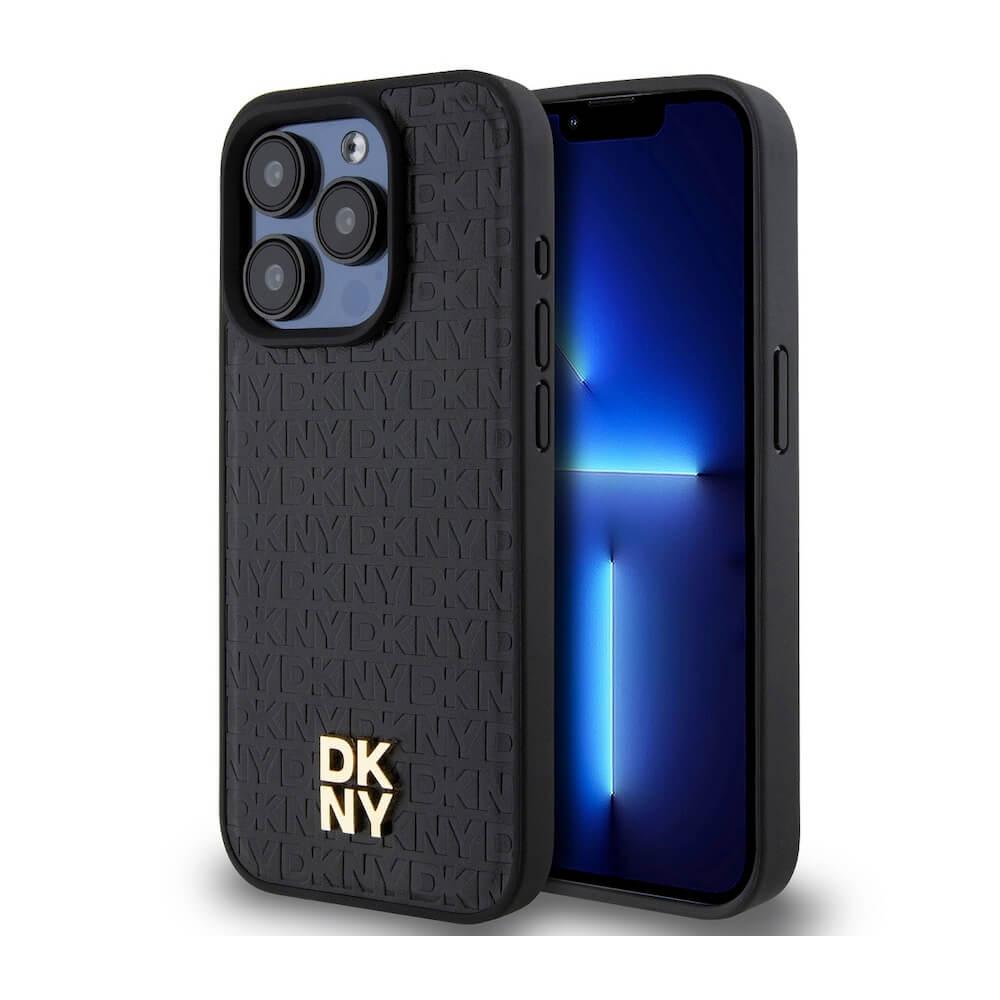 Дизайнерски кожен кейс с MagSafe за iPhone 14 Pro - DKNY Repeat Pattern Stack Logo MagSafe Leather Hard Case (черен)