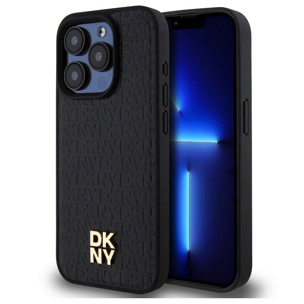 Дизайнерски кожен кейс с MagSafe за iPhone 15 Pro Max - DKNY Repeat Pattern Stack Logo MagSafe Leather Hard Case (черен)