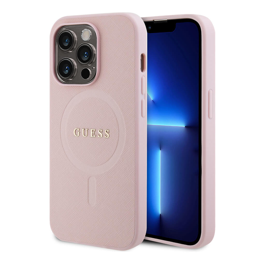 Дизайнерски кожен кейс с MagSafe за iPhone 15 Pro Max - Guess PU Saffiano MagSafe Leather Hard Case (розов)