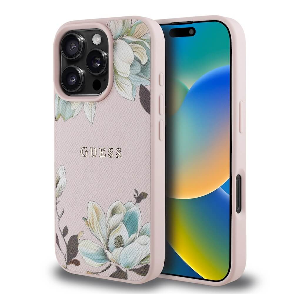 Дизайнерски кожен кейс с MagSafe за iPhone 16 Pro - Guess PU Grained Magnolia MagSafe Leather Hard Case (розов)