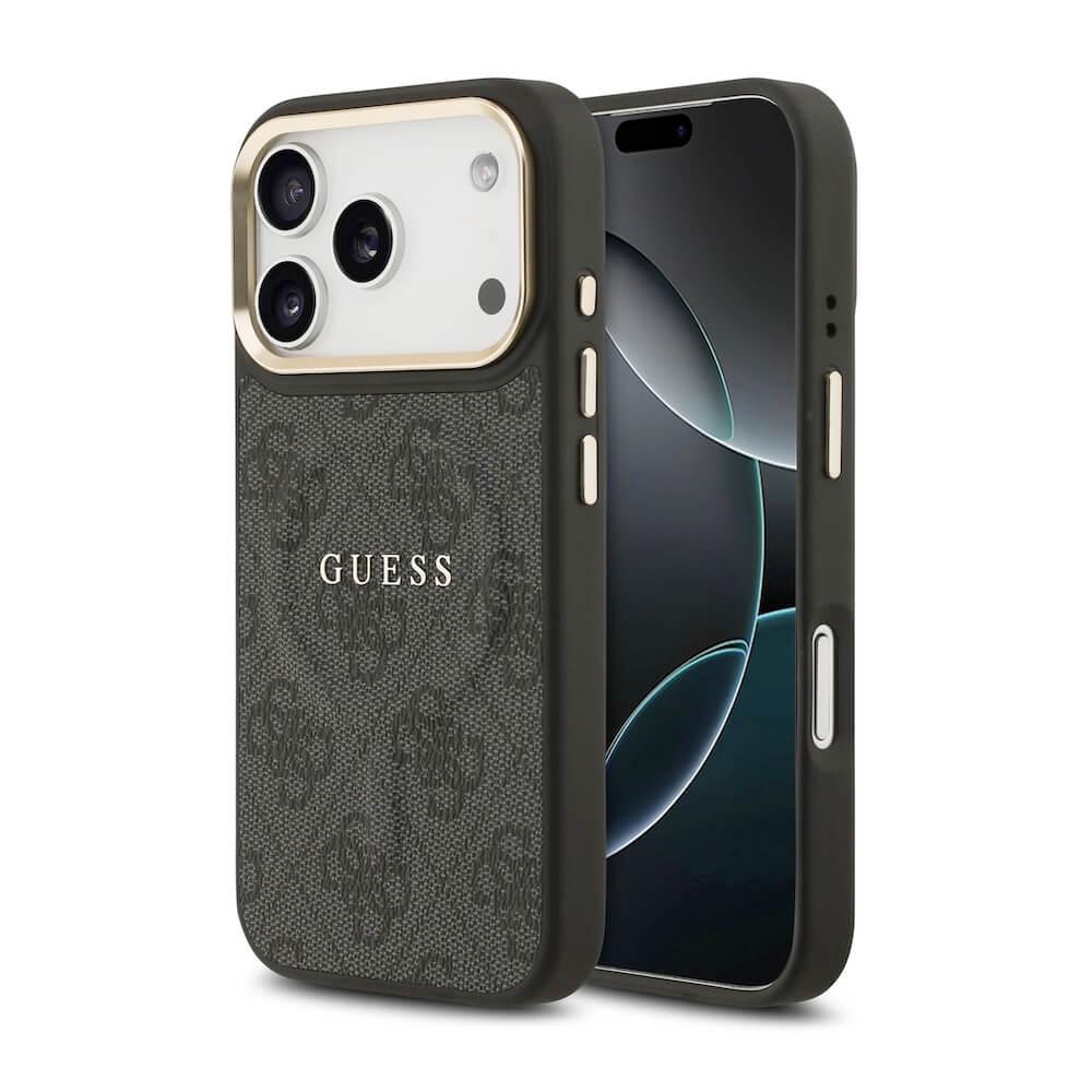 Дизайнерски кожен кейс с MagSafe за iPhone 17 Pro - Guess PU 4G Gold Frame MagSafe Leather Hard Case (черен)