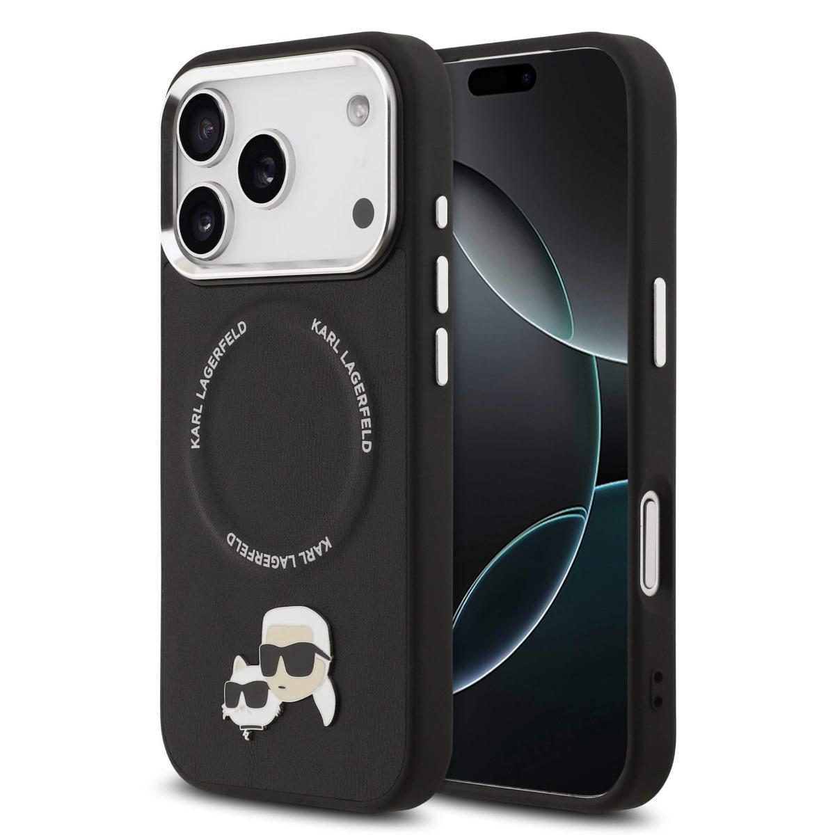 Дизайнерски кожен кейс с MagSafe за iPhone 17 Pro - Karl Lagerfeld PU Karl and Choupette Heads Pins MagSafe Case (черен)