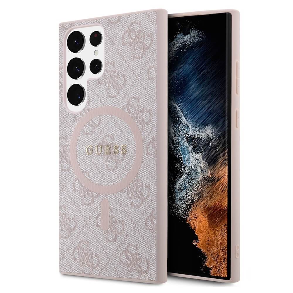 Дизайнерски кожен кейс с MagSafe за Samsung Galaxy S24 Ultra - Guess PU 4G Colored Ring MagSafe Leather Hard Case (розов)