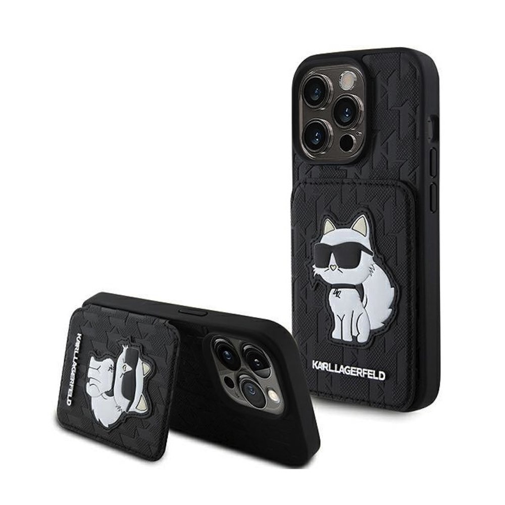 Дизайнерски кожен кейс с отделение за карти за iPhone 15 Pro Max - Karl Lagerfeld PU Saffiano Monogram Choupette Card Slot Stand Case (черен)