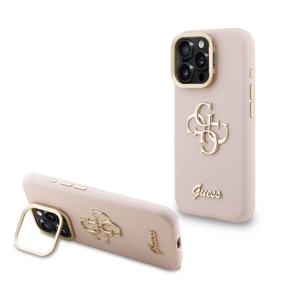 Дизайнерски кожен кейс с вградена поставка за iPhone 16 Pro Max - Guess PU 4G Grained Logo Stand Hard Case (розов)