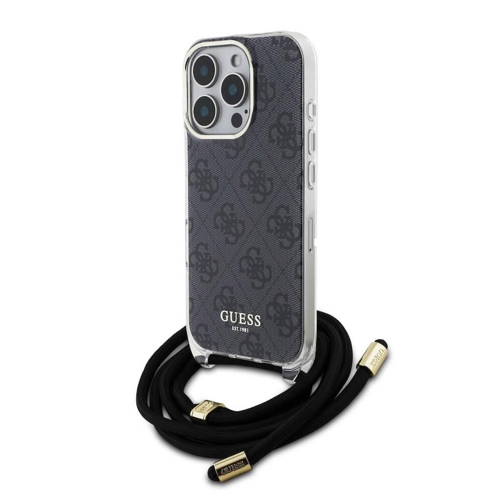 Дизайнерски кожен кейс с връзка за носене през врата за iPhone 16 Pro - Guess PU IML 4G Printed Case With Crossbody Strap (черен)