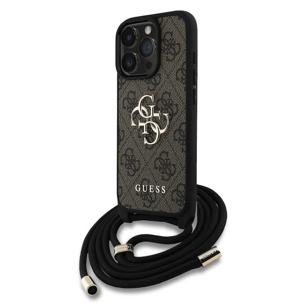 Дизайнерски кожен кейс с връзка за носене през врата за iPhone 16 Pro Max - Guess PU 4G Metal Logo Crossbody Strap Case (кафяв)