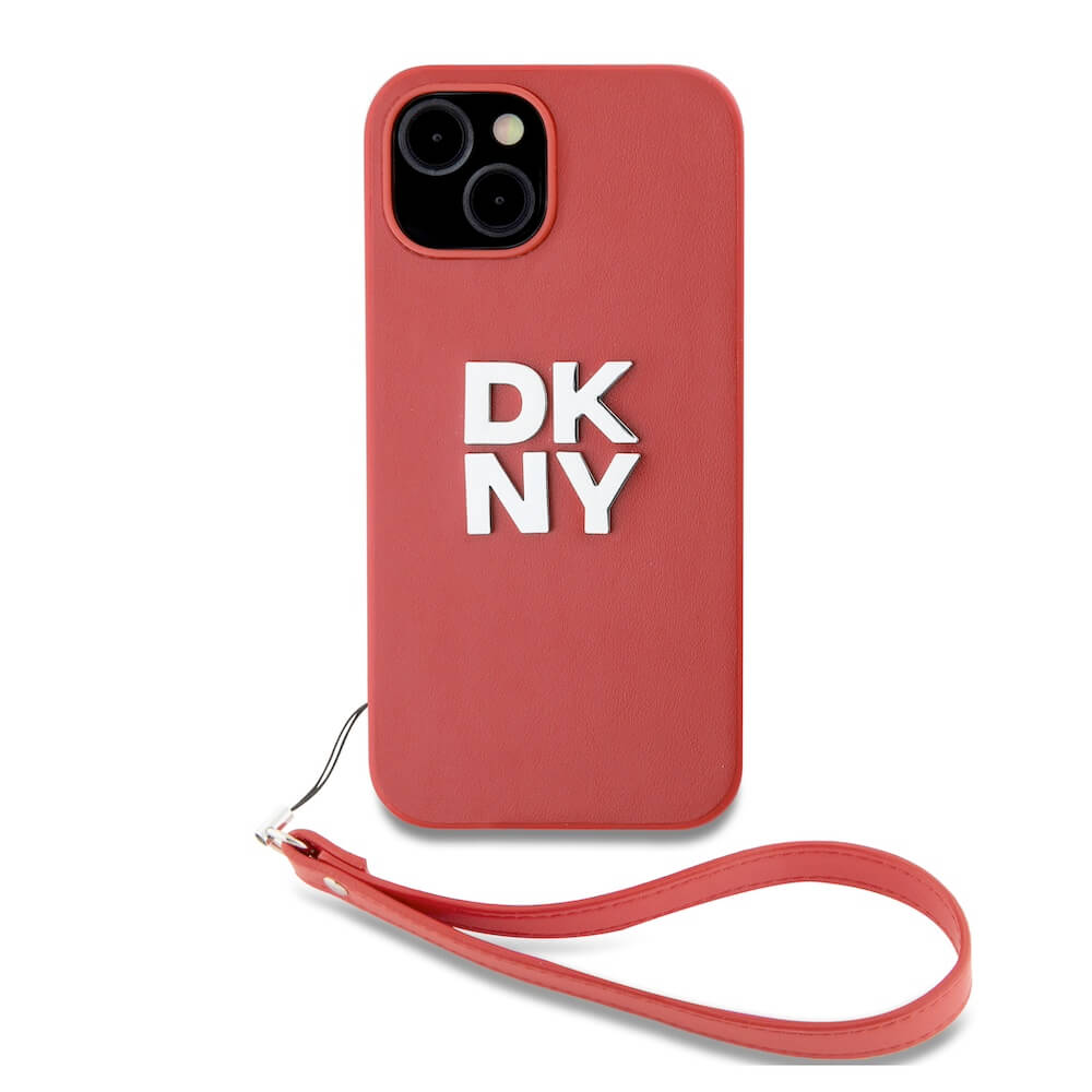 Дизайнерски кожен кейс с връзка за носене за iPhone 13 - DKNY Stack Logo Wrist Strap Leather Hard Case (червен)