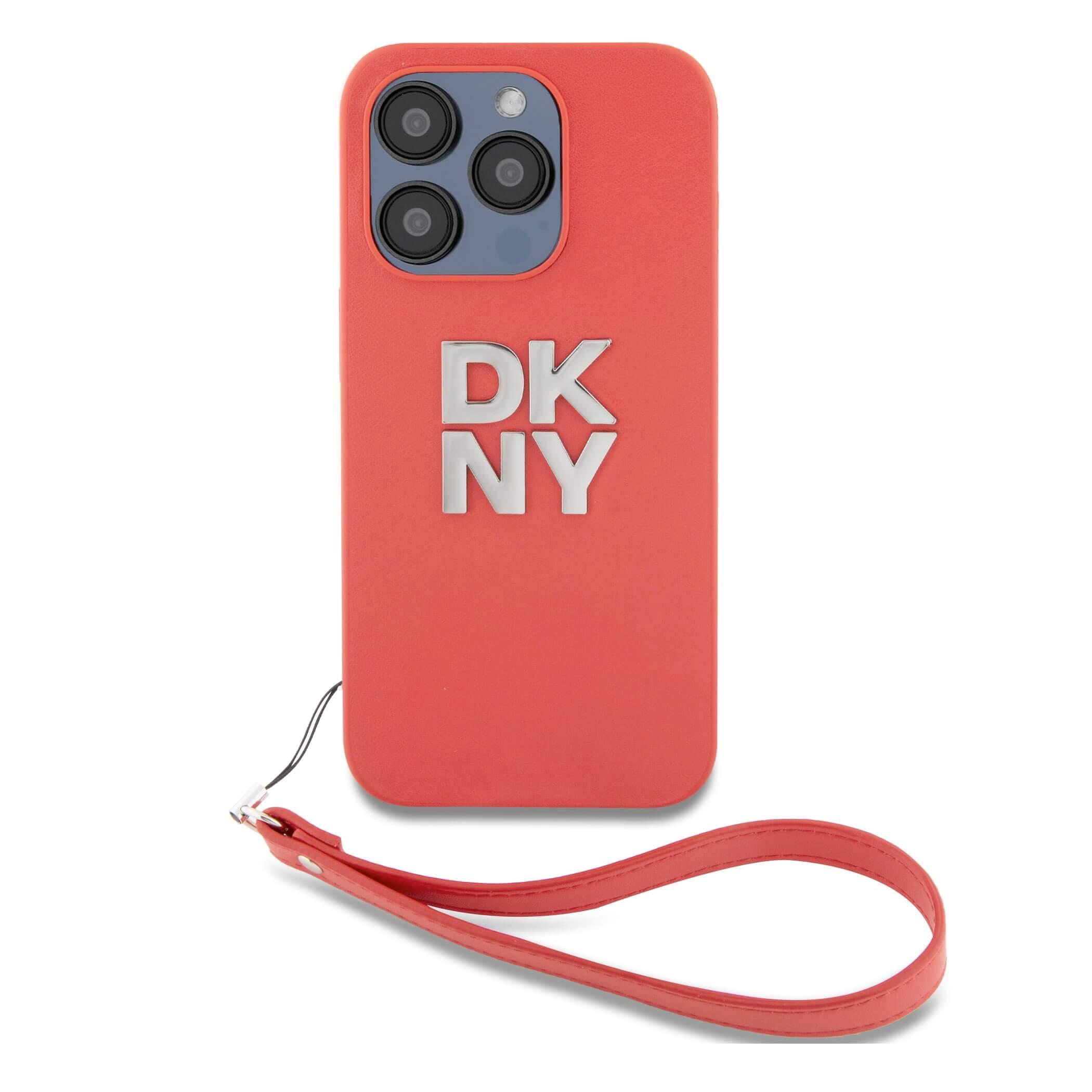 Дизайнерски кожен кейс с връзка за носене за iPhone 14 Pro - DKNY Stack Logo Wrist Strap Leather Hard Case (червен)