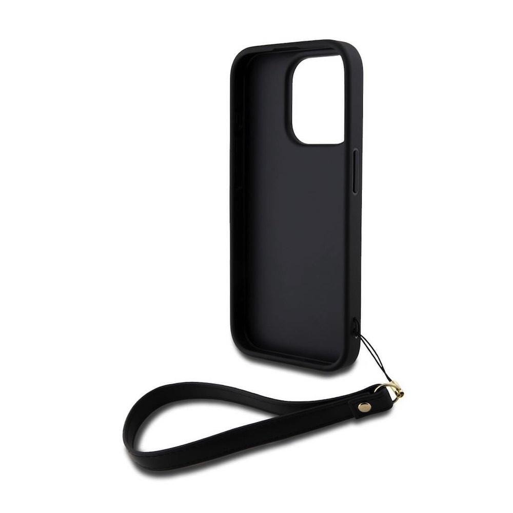 Дизайнерски кожен кейс с връзка за носене за iPhone 15 Pro - DKNY Stack Logo Wrist Strap Leather Hard Case (черен)
