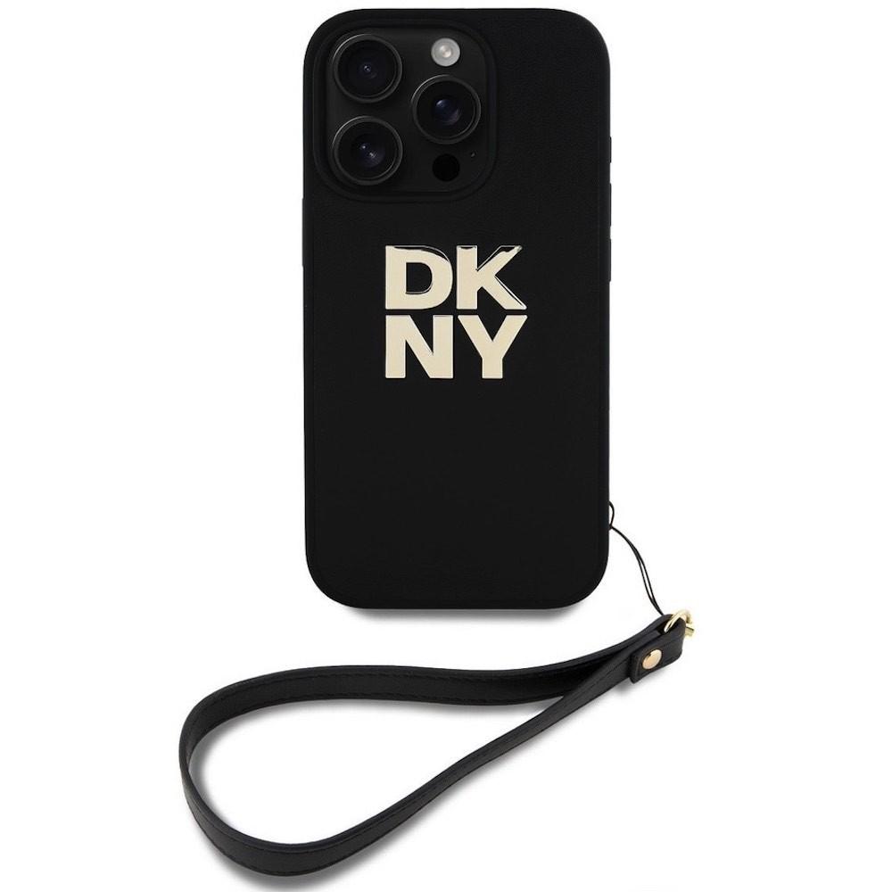 Дизайнерски кожен кейс с връзка за носене за iPhone 16 Pro Max - DKNY Stack Logo Wrist Strap Leather Hard Case (черен)