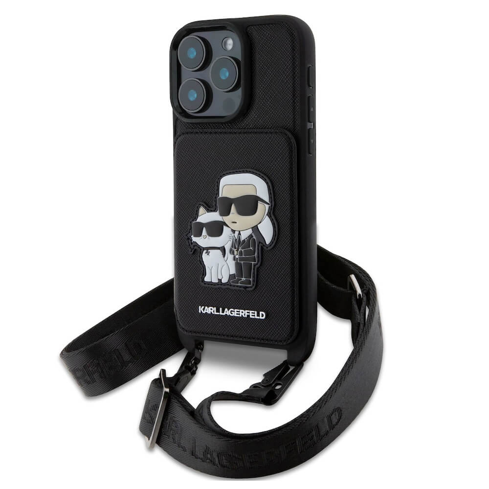 Дизайнерски кожен кейс с връзка за носене за iPhone 16 Prо Max - Karl Lagerfeld Saffiano Crossbody Karl and Choupette Case (черен)
