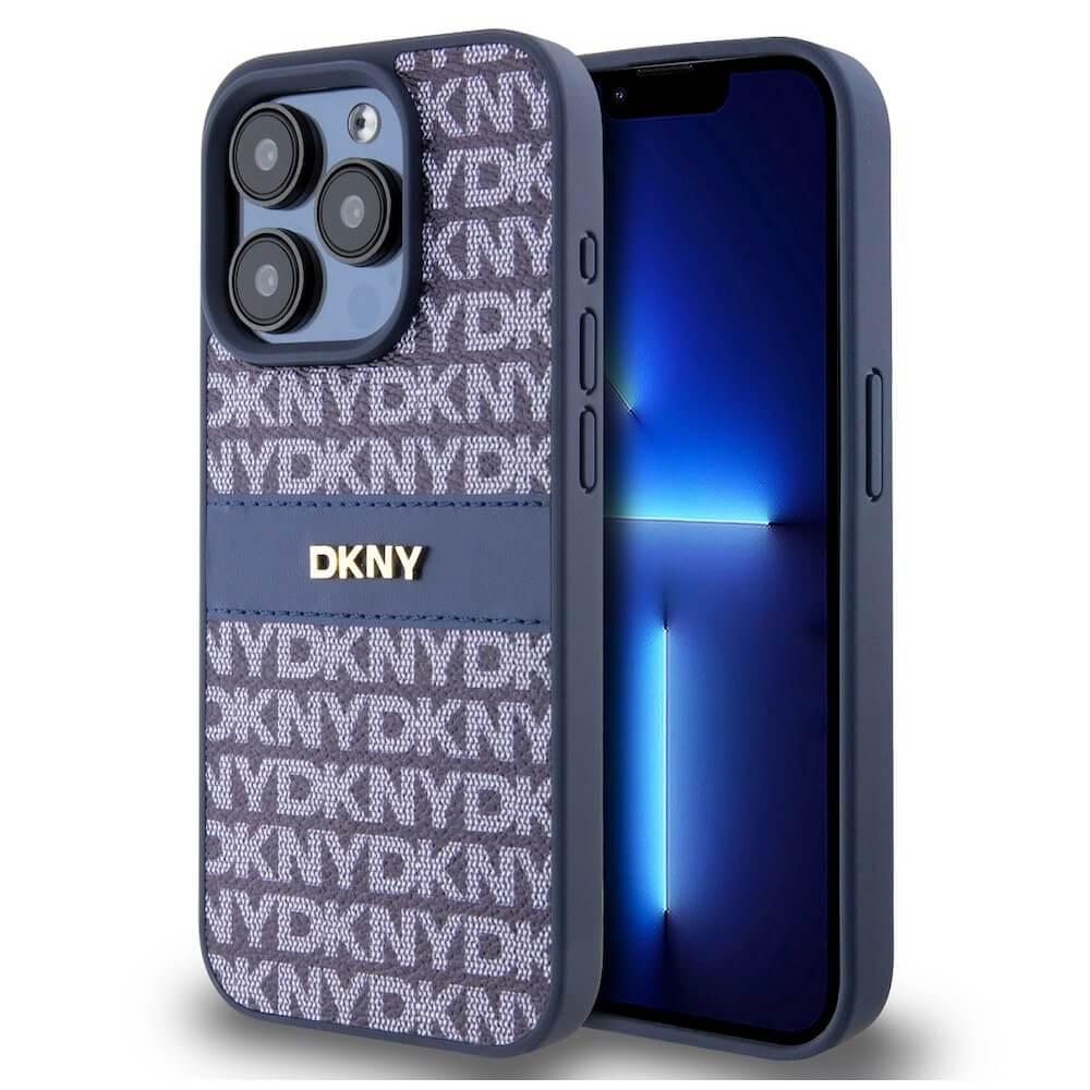 Дизайнерски кожен кейс за iPhone 15 Pro Max - DKNY Repeat Pattern Tonal Stripe Leather Hard Case (тъмносин)