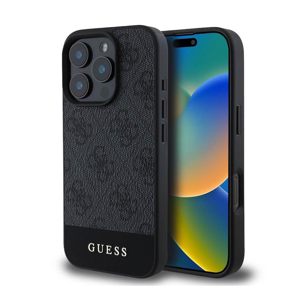 Дизайнерски кожен кейс за iPhone 16 Pro - Guess PU 4G Stripe Leather Hard Case (сив)