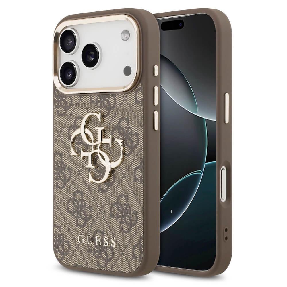 Дизайнерски кожен кейс за iPhone 17 Pro Max - Guess PU 4G Metal Logo Gold Frame Leather Hard Case (кафяв)