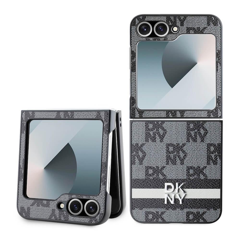 Дизайнерски кожен кейс за Samsung Galaxy Z Flip7 FE, Z Flip6 - DKNY Checkered Pattern and Stripe PU Leather Hard Case (черен)