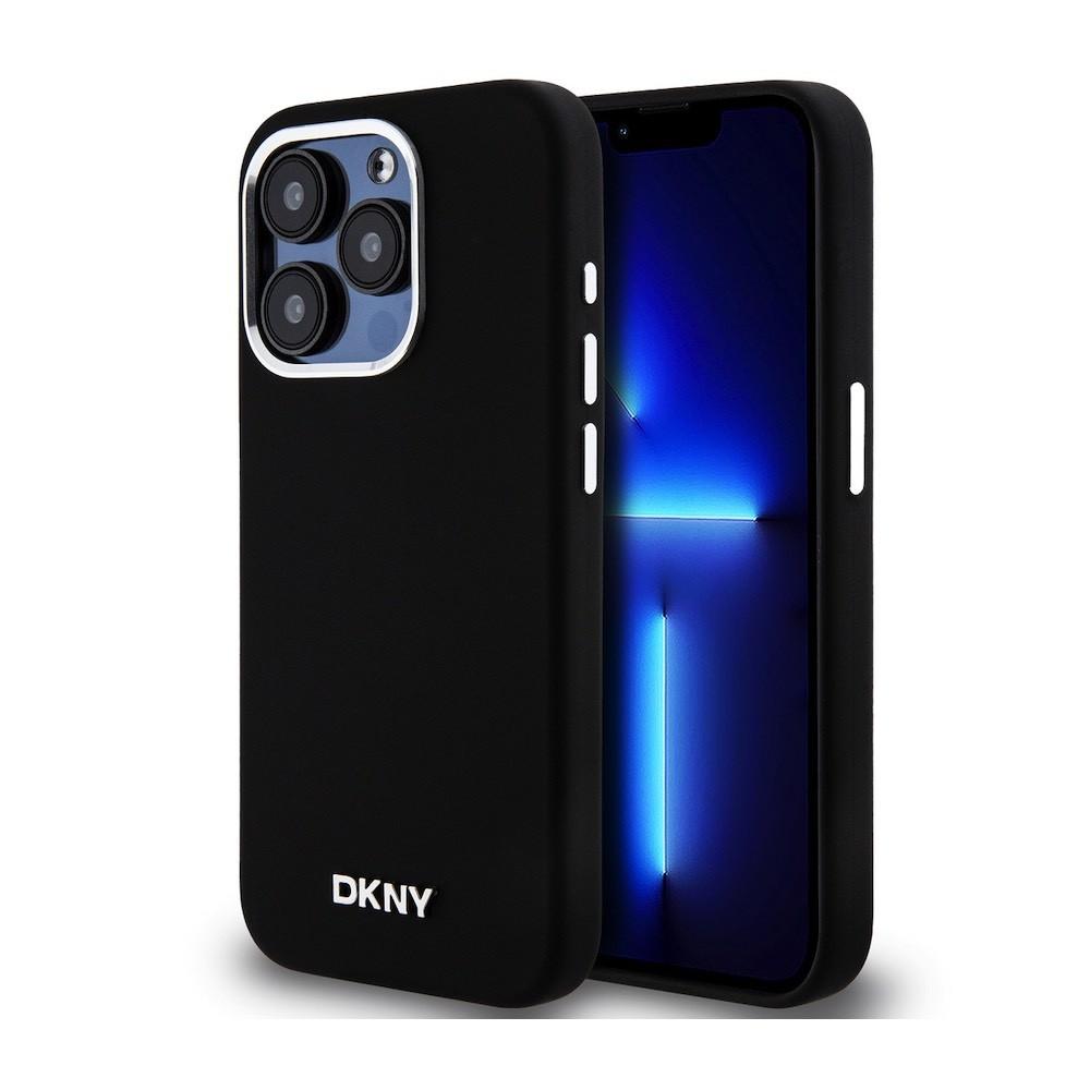 Дизайнерски силиконов кейс с MagSafe за iPhone 15 Pro - DKNY Liquid Silicone Silver Metal Logo MagSafe Case (черен)
