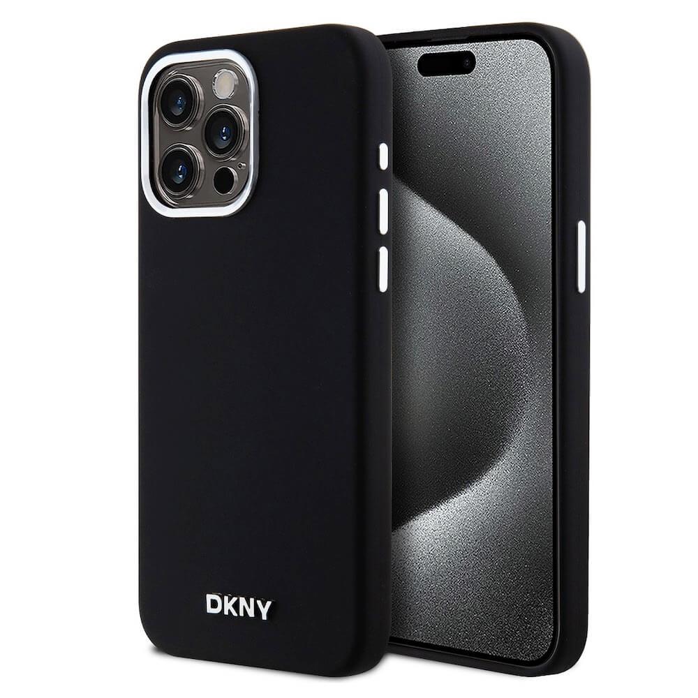 Дизайнерски силиконов кейс с MagSafe за iPhone 15 Pro Max - DKNY Liquid Silicone Silver Metal Logo MagSafe Case (черен)