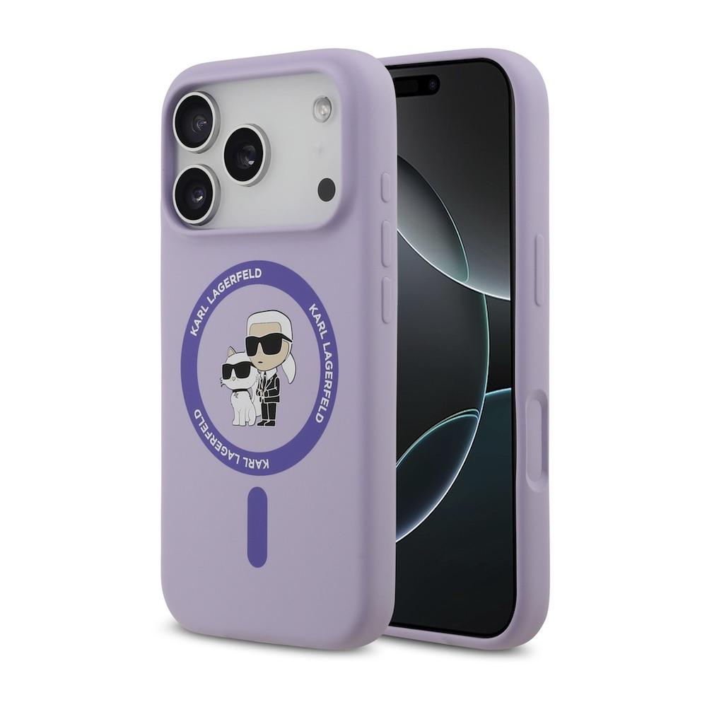 Дизайнерски силиконов кейс с MagSafe за iPhone 17 Pro - Karl Lagerfeld Liquid Silicone Karl and Choupette Heads MagSafe Case (лилав)