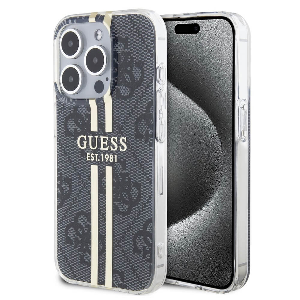 Дизайнерски силиконов кейс за iPhone 15 Pro Max - Guess IML 4G Gold Stripe Case (черен)