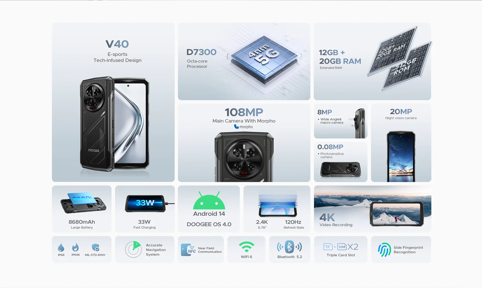 Equipped with Android 14, the DOOGEE V40 provides a seamless user experience filled with the latest features and security updates. Plus, its rugged design ensures that it can withstand the rigors of daily use, including drops and exposure to various elements. Therefore, whether you're on a construction site or hiking in the mountains, the DOOGEE V40 is built to handle it all.