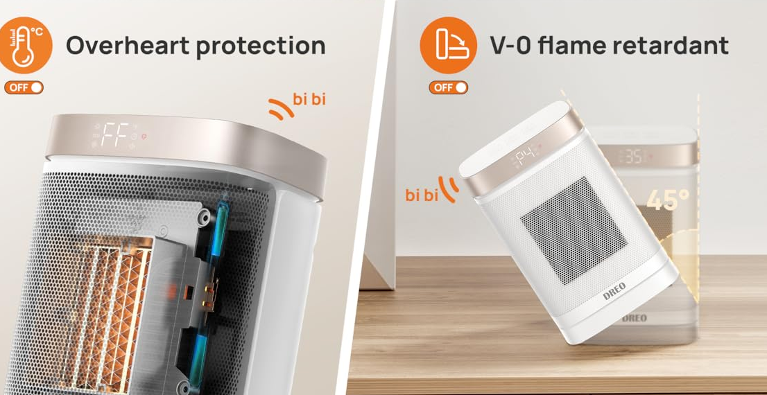 Shield 360° protection: Dreo Room Heater Heat up your day and night without worries. CE-listed Shield360° system provides tip-over and overheat protection, as well as an enhanced safety plug. Along with V-0 flame-retardant materials to ensure ultimate safety in all aspects.