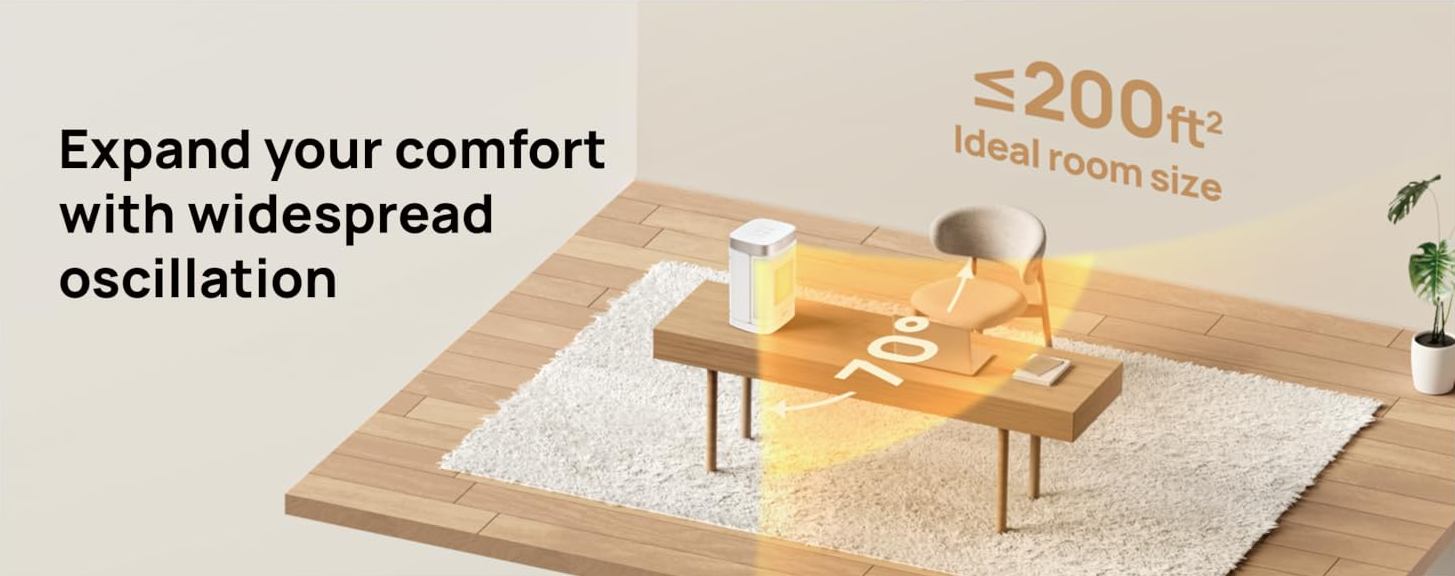 Experience the heat that envelopes you in the widest way possible. 70° wide-angle oscillation sweeps around to cover the whole area, providing wide-reaching heat for your bedroom, garage, basement, office, desktop, etc.