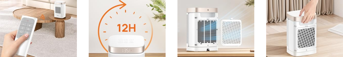 Convenience at Hand Use the intuitive remote control to set up your heater the way you want, without leaving your comfort zone | 1-12h Adjustable Timer Never worry about the heater running all day long. Set your heater on a timer of 1 to 12 hours before you go to bed or out | Washable, Detachable Filter Dust and lint are kept at bay at all times thanks to a washable, detachable filter at the air inlet | Carry Effortlessly Weighed in only 4.4 pounds, Dreo comes with a hidden handle so you can carry around to wherever needed |
