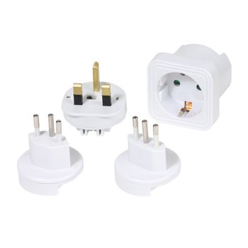 Преходник Vivanco 36217, от Schuko(ж) към UK, Swiss, Italy(м), с приставки, бялПреходник Vivanco 36217, от Schuko(ж) към UK, Swiss, Italy(м), с приставки, бял