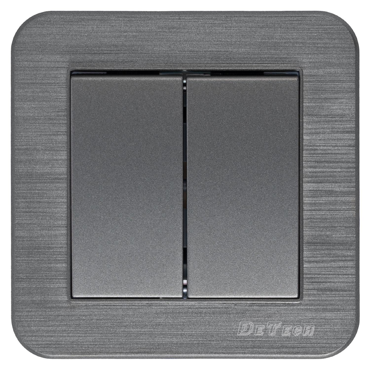 Двоен ключ за осветление DeTech DE-9223-02 (схема 5) с класически квадратен дизайн и декоративна рамка, в сив цвят.