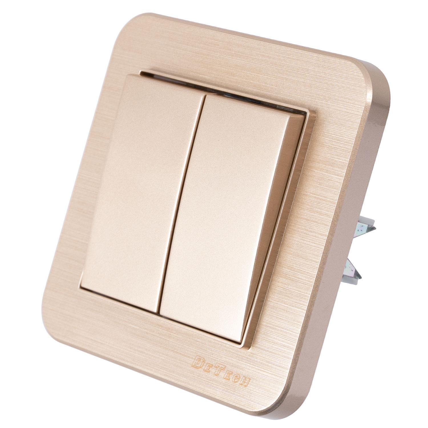 Двоен ключ за осветление DeTech DE-9223-02 (схема 5) с класически квадратен дизайн и декоративна рамка, в златист цвят.